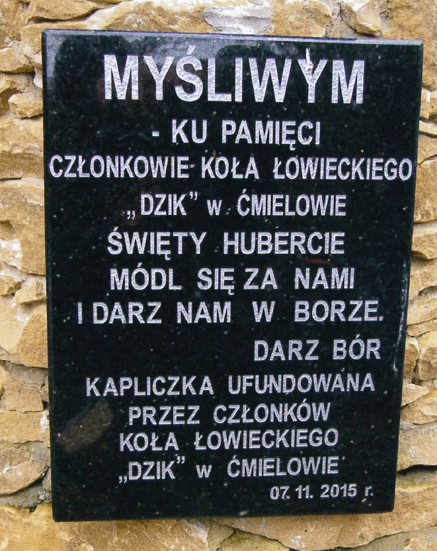 Dla uczczenia wieloletniej tradycji Koła, w listopadzie 2015 r. na Czarnej Glinie odbyło się poświęcenie ufundowanej przez członków naszego Koła kapliczki ku czci patrona myśliwych - św. Huberta. Okorowany pień zwieńczony daszkiem, a wewnątrz rzeźba postaci świętego. Stoi na podmurówce z kamienia. Drewniane cudo wtopione w przyrodę. niespotykana w formie, z oryginalnym w treści napisem. Powstała z inicjatywy i przy wielkim zaangażowaniu Łowczego Koła, Kolegi Marka Pękalskiego oraz ówczesnego Zarządu Koła. Kapliczka to przystań, miejsce zadumy, podejmowania decyzji, oceny dokonań i podsumowań. Serdecznie dziękujemy za pomoc w realizacji projektu ówczesnemu Leśniczemu Leśnictwa Jeziórko - Janowi Jamrozowi!